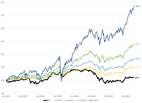 Andamento indice governativo che comprende l’intero spettro delle emissioni governative italiane (linea nera) confrontato con quello delle linee bilanciate (Core 4, Core 5 e Core 6) e della linea 100% azionaria (Core 7) di Euclidea.